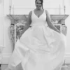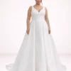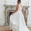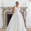 Poised with understated elegance, the Ashby Curvegown by Romantica of Devon captures timeless grace and sophistication. Crafted from luxurious pristine mikado, this gown’s plunging V-neckline and sleeveless bodice flow seamlessly into a majestic full A-line skirt, creating a luminous silhouette that radiates both serenity and style.