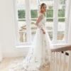 Graceful bishop-style sleeves, finished with matching floral appliqué, add a whimsical touch as they drape softly over the arms. The gown’s flowing A-line silhouette and tulle overlay are embellished with cascading florals that appear to blossom from the hem upward. For added versatility, the Blossom gown includes a detachable floral lace jacket, allowing brides to transform their look effortlessly from ceremony to celebration.