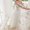 The Blossom gown by Romantica of Devon captures the essence of romance and nature’s beauty in full bloom. This ethereal bridal design features delicate floral embroidery that evokes the charm of a springtime garden. A classic sweetheart neckline flows seamlessly into a soft sheer overlay adorned with intricately placed botanical motifs in shades of ivory and subtle earth tones, creating a look that’s both timeless and dreamlike.