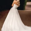 The fully gathered skirt creates a voluminous princess silhouette with exceptional movement and flow. A discreet glitter tulle layer beneath the outer fabric adds subtle sparkle without overwhelming the design. The gown is completed with a chapel-length train, delivering graceful drama from every angle.