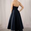 The strapless bodice is paired with a softly flared A-line skirt, creating a flattering shape that defines the waist while allowing effortless movement. A lightly gathered chiffon waistband adds softness and texture, enhancing the feminine lines of the gown without overpowering its clean, minimalist silhouette.