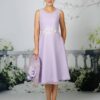 A delicate lace appliqué at the waist adds refined detail and subtle definition, enhancing the overall shape without compromising comfort. The clean, softly draped lines make this dress wonderfully versatile, and it pairs perfectly with the coordinating jacket EJ021 for added coverage and occasion styling. The dress measures 28″ / 71cm from waist to hem, offering a classic and flattering tea-length finish.