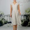 A flattering V-neckline is paired with delicate cap sleeves, offering light coverage while maintaining a refined, elegant feel. A smooth satin waistband defines the waist and adds subtle contrast, enhancing the overall shape without overpowering the delicate lace detailing. The dress measures 28″ / 71cm from waist to hem, creating a classic and wearable tea-length finish.