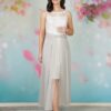 A fitted jersey base provides a smooth and flattering foundation, while the delicate Ivory lace bodice adds timeless texture and feminine detail. The chiffon overlay skirt falls softly from the waist, creating fluid movement and a romantic finish that skims the figure effortlessly. Measuring 23″ / 58cm at the front and 38″ / 96cm at the back from waist to hem, this design offers an elegant high-low effect ideal for formal wedding celebrations.