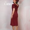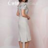 The dress fastens neatly at the back with an invisible zip for a smooth and secure finish. Shown here in Platinum and Burgundy, with the store sample available in Burgundy. The skirt measures approximately 28″ from waist to hem.