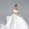 Off-Shoulder Satin Ball Gown with Folded Neckline and Full Train
