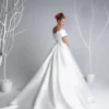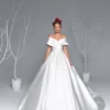 The Eva Lendel Emma wedding dress embodies pure elegance and regal simplicity. Crafted from luxurious satin, this gown features an off-shoulder folded neckline that beautifully frames the collarbone and shoulders, adding a touch of modern romance to a classic silhouette.
