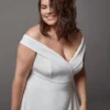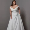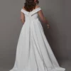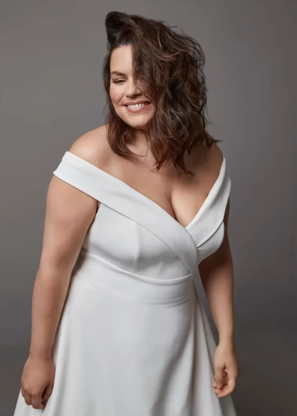 Nova Rea Curve Romantica of Devon – Exuding modern elegance, this A-line wedding dress crafted from crepe features an off-the-shoulder neckline that adds a touch of sophistication. The asymmetrical bodice is contemporary twist, resulting in a captivating ensemble that perfectly balances timeless beauty with a modern edge, making it a stunning choice for your special day. Shown in Ivory.