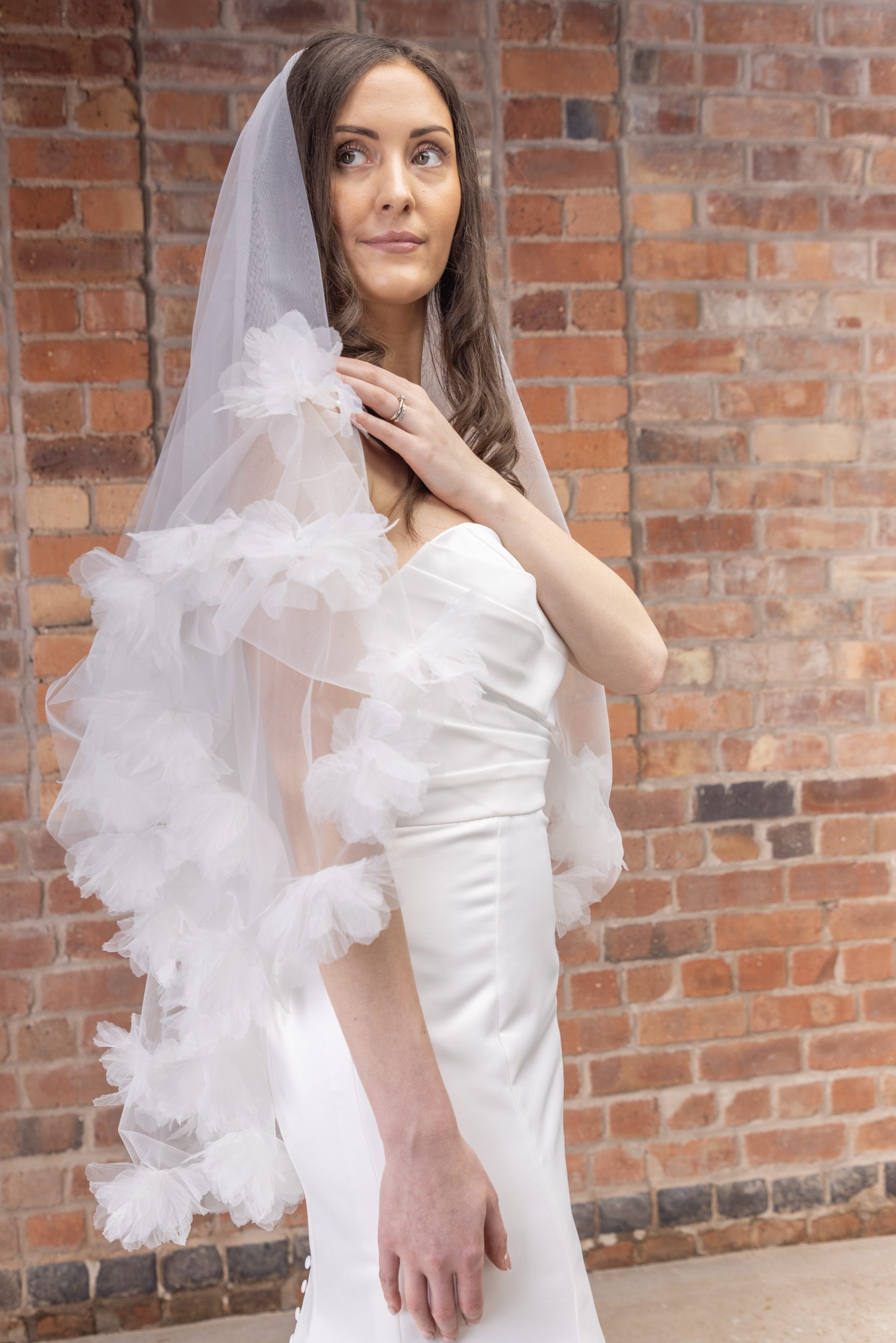 One for the romantic fashionistas, PBV9069 Floral Edged Veil is a wearable 100cm length which sits at fingertip length, elegantly framing the bodice. The edge of the veil is adorned with two rows of stunning 3D embellishment which add a bit of weight to the veil, creating gentle movement as you walk. Statement but soft, this beautiful veil comes complete with a metal comb attached to secure it into place.