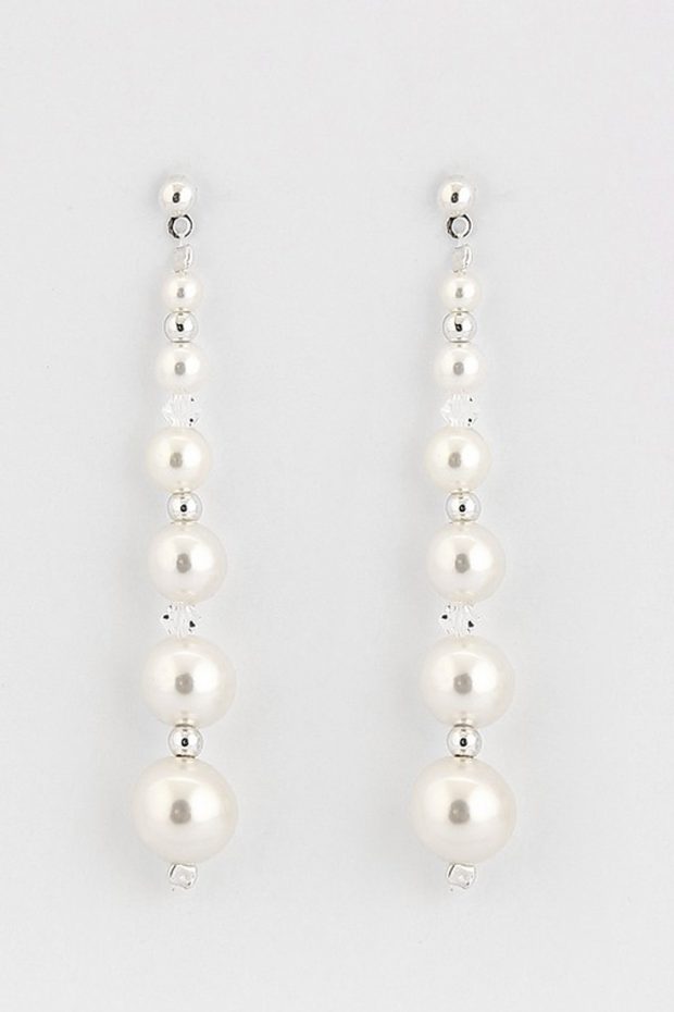 Richard Designs P904E Pearl & Crystal Drop Earrings. Indulge in the timeless elegance of our Chic and Stylish Pearl Earrings. These earrings are a captivating blend of classic and modern, featuring lustrous graduated ivory pearls adorned with Crystal and silver beads. Crafted with meticulous attention to detail, These long pearl drop earrings are a mix of graduating pearls and crystal beads on silver plated posts.
