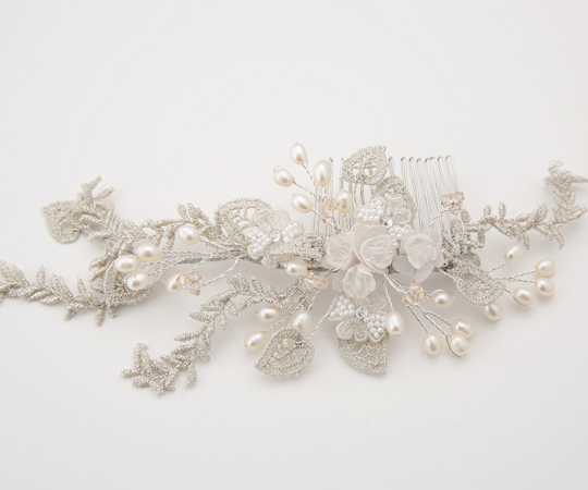 Richard Designs TR2322 Silver Lace & Pearl Hair Comb. Beautiful lace embroidered foliage, with Pearl buds and tuille flowers.