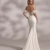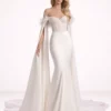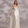 Soft off-shoulder feathered straps add a touch of vintage luxury, while the sleek crepe skirt flows seamlessly into a long, elegant train. The optional floor-length cape creates a dramatic, regal look — perfect for brides who want to make a grand entrance.